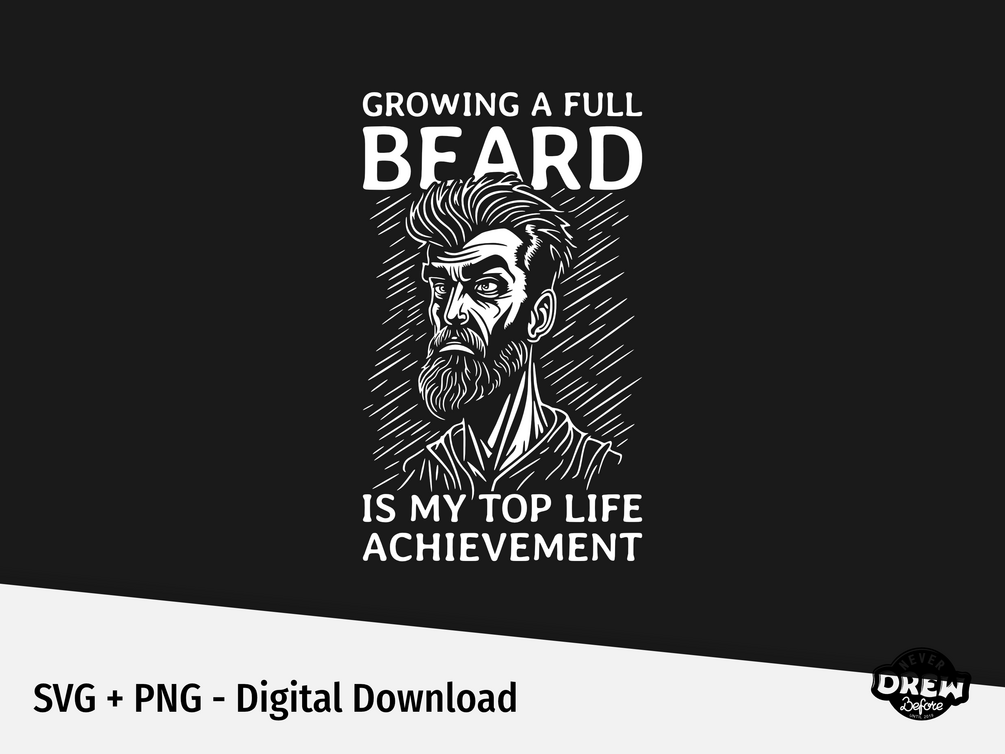 Celebrate your beard journey with our "Growing a Full Beard is my Top Life Achievement" SVG. This design, tailored for men, features a proud bearded man who knows the value of a full beard. Perfect for T-shirts and other clothing, this design adds a touch of humor and personality to your wardrobe.